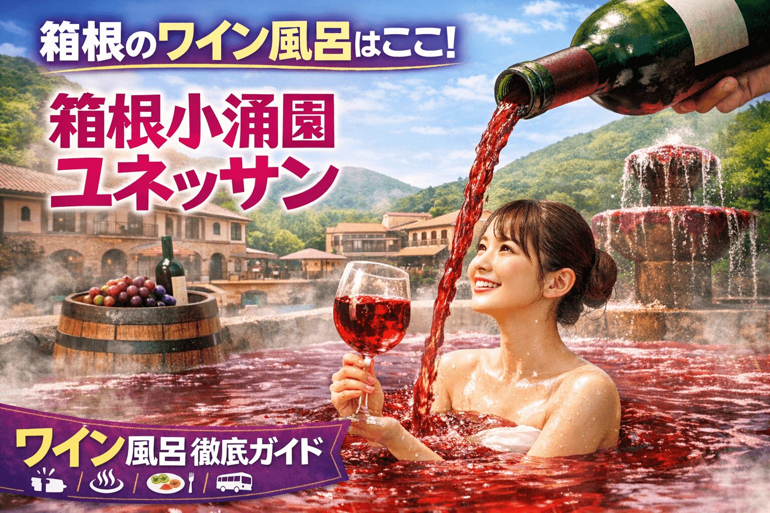 箱根でワイン風呂を探しているなら、箱根小涌園ユネッサンはかなり有力な候補です。海エリアの名物風呂としてワイン風呂が用意され、投入イベントまであるため、「箱根らしい温泉」と「ここでしか味わえない体験」の両方を楽しめます。アクセスもしやすく、食事処も館内にあり、日帰りでも組み込みやすいのが強みです。