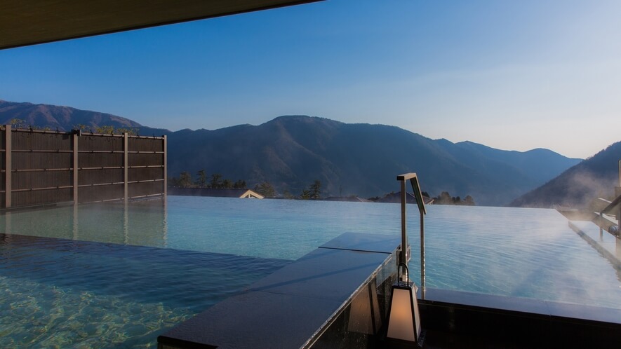 箱根小涌園 天悠。全室露天風呂付きという特別感と、インフィニティ風呂からの絶景は、特別な日の思い出作りにぴったりです。