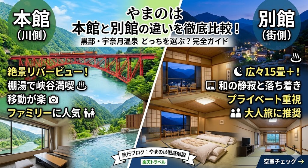 黒部・宇奈月温泉やまのはにおける「本館」と「別館(別邸)」の最大の違いは、**「客室からの眺望と館内移動の利便性(本館)」か、「和の静寂とゆとりある空間設計(別館)」**かの二極化にあります。