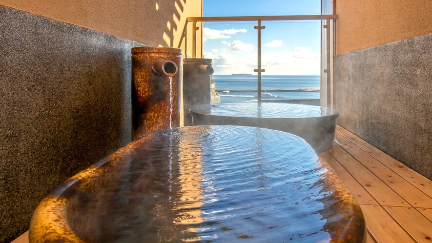 大浴場に入ると、湯気が立ち込める中に、どこか甘く、そして潮の香りが微かに混じる温泉特有の香りが漂います。内湯でじっくりと体を温めた後、吸い寄せられるように向かったのが露天風呂です。そこには、空と海が溶け合うような開放的な景色が待っていました。昼間は青い空がどこまでも続き、夜には遠くに浮かぶ初島や大島の灯り、そして月明かりが水面に道を作ります。