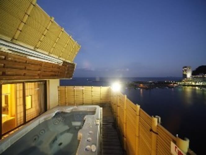 露天風呂の湯船に身を沈めると、目線の高さがちょうど水平線と重なるように設計されています。空と海、そして温泉が一つに溶け合うような「インフィニティ」に近い感覚。昼間はキラキラと輝く水面を、夜は熱海市街の宝石のような夜景と漆黒の海を眺めながら、ただただお湯に身を委ねる。この時間は、まさに無の状態になれる贅沢なひとときです。