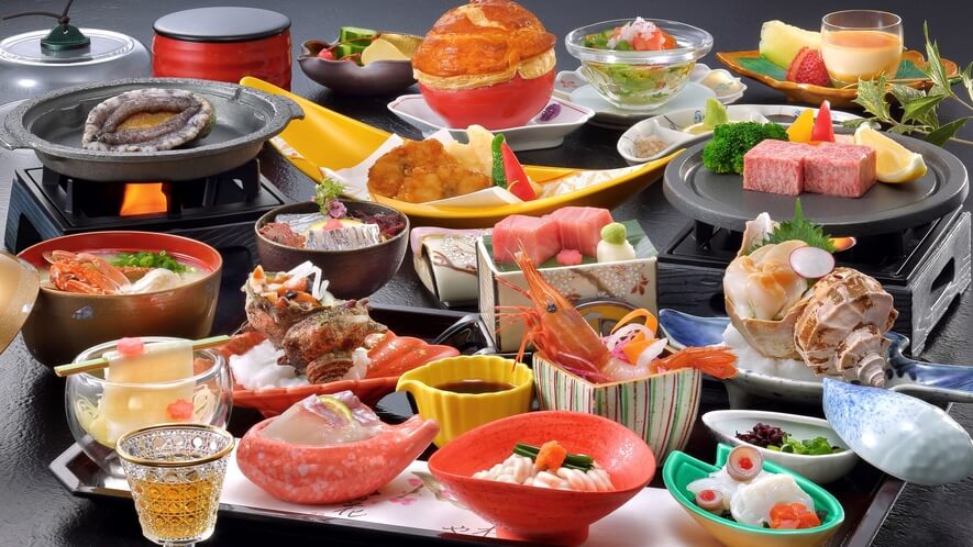 日本海の荒波で育った新鮮な魚介類(季節ごとの旬の魚、エビ、カニなど)のお造りや、きめ細かい肉質と甘みが特徴の「山形牛」「庄内豚」を使った肉料理がメインとなります。地元の契約農家から仕入れる新鮮な野菜や、庄内米など、地産地消への強いこだわりが感じられます。お祝い記念日プランでは、鯛の尾頭付きや特製ケーキ、乾杯のドリンクなどが追加されることもあり、特別な日の食卓を華やかに演出してくれます。一人旅の場合は、周りの目を気にせずゆっくり食事ができる部屋食プランや、個室風の食事処を利用できるプランを選ぶと、よりリラックスして美食を堪能できます。