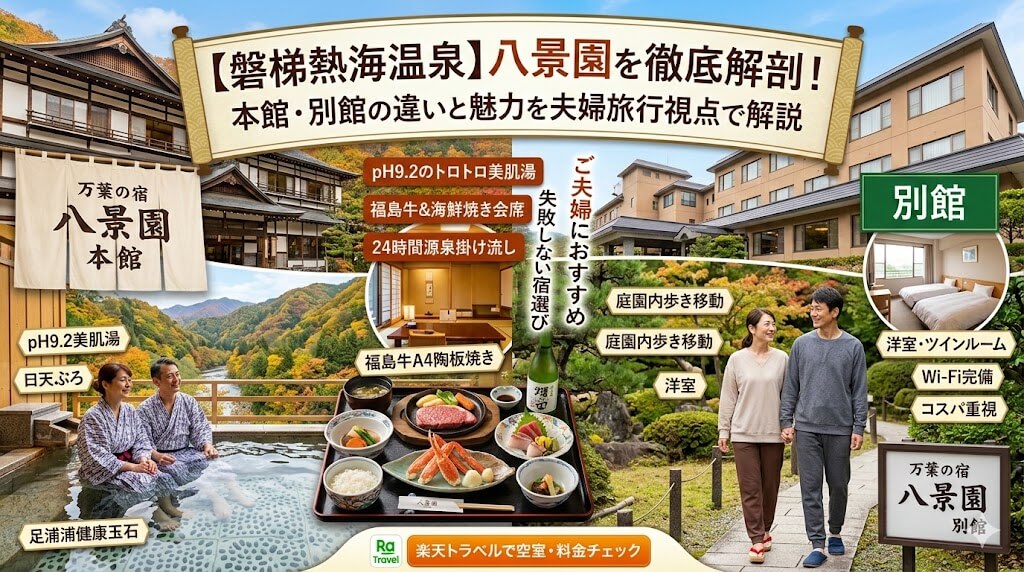 この記事を最後までお読みいただくことで、あなたとパートナーの旅行スタイルに「万葉の宿 八景園」が適合するかどうかが明確になり、宿泊後の「こんなはずじゃなかった」という失敗を100%回避できると確約します。ご夫婦の大切な時間を預けるにふさわしい宿かどうか、厳しい目で見極めてください。