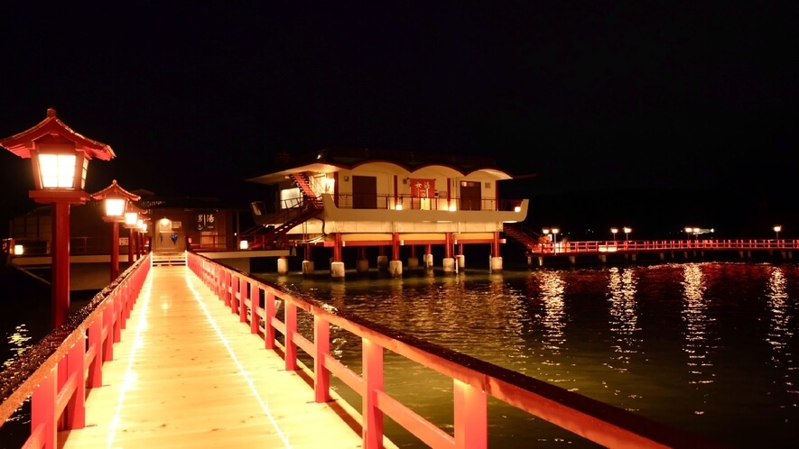 - 湖上露天風呂への移動について本館から湖上風呂へ続く赤い橋は「屋外」です。冬場や風の強い日は、橋を渡る数十メートルの間、寒さを感じます。館内備え付けの防寒着(丹前など)をしっかり羽織って移動してください。
