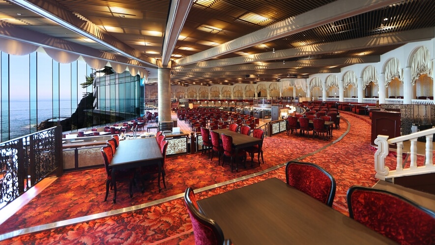 - メインダイニング「錦」:扇形の巨大なレストラン。どの席からも海が見える設計。