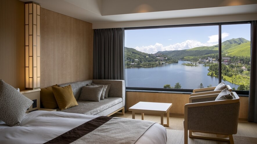 - 特徴: 全室が白樺湖に面したレイクビュー。約32㎡〜40㎡のゆとりある空間に、琉球畳と米国シモンズ社製の最高級ベッドマットレス(厚さ約30cm)を採用。和の寛ぎと洋の快適さを融合させています。