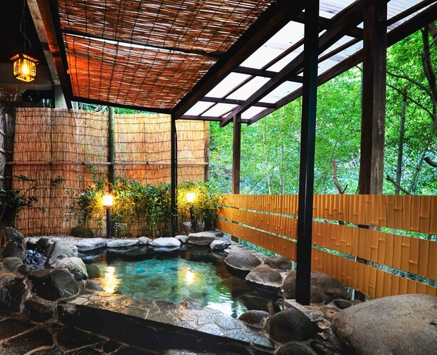 • ロケーション: 手入れの行き届いた竹林が目前に迫り、夜はライトアップされます。風に揺れる竹の葉音を聞きながら浸かる温泉は、まさに非日常。