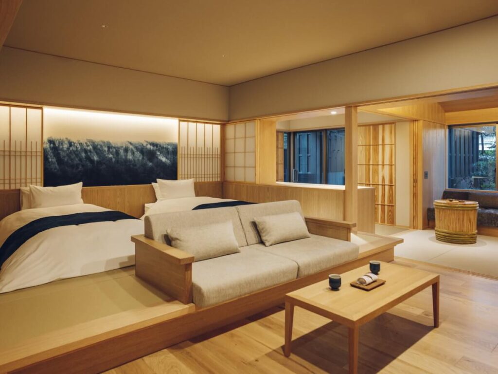 「界 玉造」の客室は、大きく分けて「露天風呂付き」と「スタンダードな和室」の2タイプです。どちらも約40平米〜50平米というゆとりある広さが確保されています。