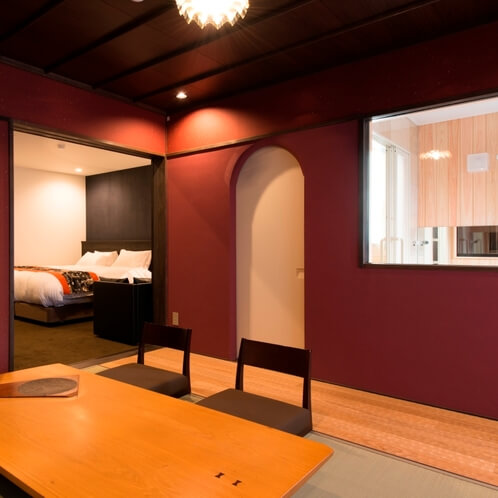 - 紅梅(Koubai)/ 101号室: * 特徴: 敷地内で最も広い約53㎡のフラットな和洋室。網代天井の玄関から始まり、キングサイズのダブルベッドと、ゲストの宿泊も可能な和室、そして専用の奥庭に面した露天風呂を完備しています。