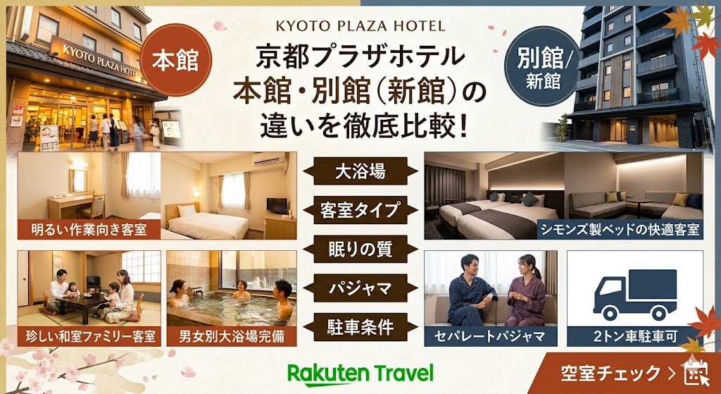 京都駅八条口から徒歩圏内、ビジネスや観光の拠点として圧倒的な支持を得る「京都プラザホテル」。しかし、予約画面で「本館」と「別館(新館)」の選択肢を前に、「どっちを選べばいいの?」「設備や朝食に違いはあるの?」と迷う方は少なくありません。