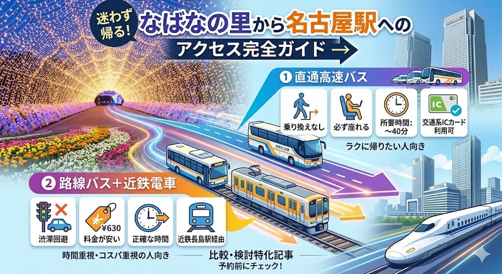 なばなの里で美しい花々や、日本最大級の壮大なイルミネーションを満喫した後、「さあ、名古屋までどうやって帰ろう?」と迷ってしまう方は少なくありません。