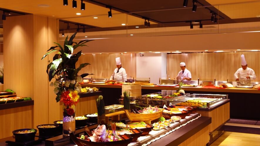 ますやのビュッフェ会場は、客室数に見合った適正な広さです。料理の補充が非常にスムーズで、ライブキッチン(天ぷらやステーキの調理)を間近に楽しめます。地元の旬の食材を活かした「季節限定メニュー」に定評があり、欲張りすぎず、好きなものを丁寧に食べたい大人世代の満足度が高い傾向にあります。