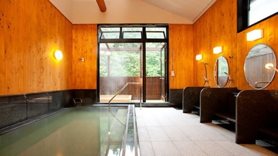 本館4階から続く別館の奥にあります。内湯は木の温もりが感じられる造りで、15人ほどが入れる広さ。そこから併設された露天風呂へと続きます。露天風呂は岩造りで、四季折々の山の自然(冬は雪見風呂)を楽しみながら入浴できます。深夜に男女の暖簾が入れ替わるため、朝晩で異なる風情を楽しめます。