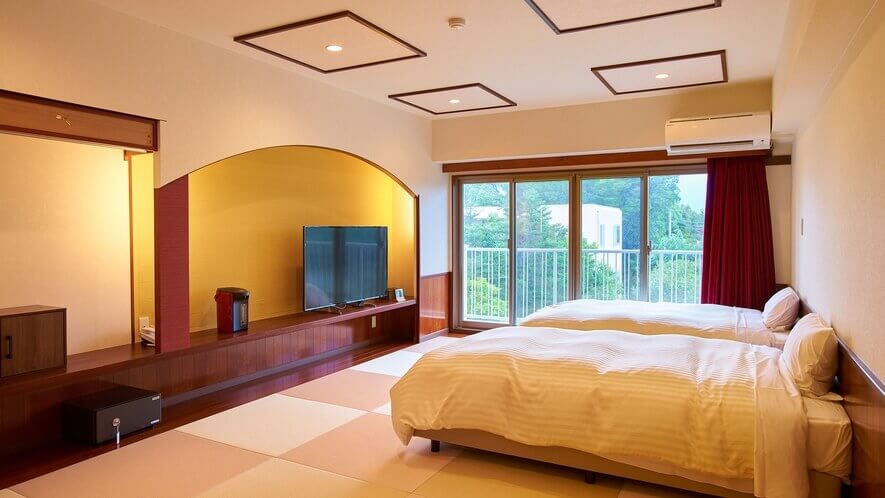 2. 和洋室:畳のスペースとベッドが両方備わったタイプ。シニア層や「寝るのはベッドが良いけれど、くつろぐのは畳が良い」という方に最適です。広さに余裕があるため、3名以上のグループ利用でも窮屈さを感じにくいのがメリットです。