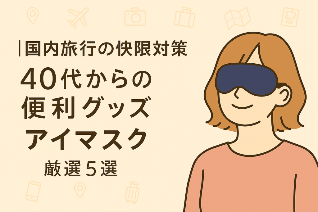 【国内旅行の快眠対策】40代からの便利グッズ「アイマスク」厳選5選 国内旅行を楽しみにしていたのに、移動中に眠れなくて疲れてしまった…そんな経験はありませんか?特に40代以上になると、日頃の疲れもあり「睡眠の質」が旅の満足度を左右する大きな要因... -