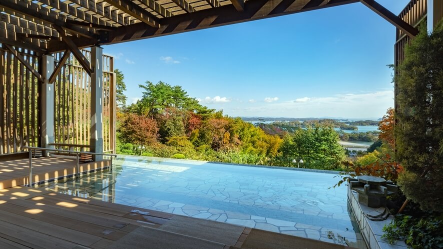 - 露天風呂: 海風を直接感じられる岩風呂仕様。湯船に浸かると目線と同じ高さに松島湾の水平線が広がり、島々の合間を行き交う遊覧船や、カモメの姿を観察できます。