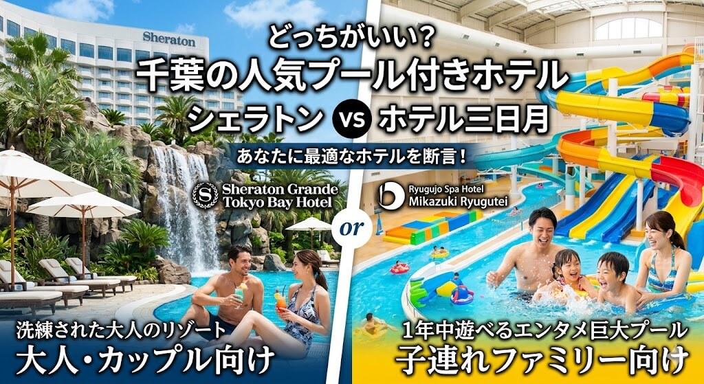 千葉エリアで「プール」や「非日常感」を重視してホテルを探しているあなたへ。シェラトン・グランデ・トーキョーベイ・ホテルと、龍宮城スパ・ホテル三日月 龍宮亭、この2つの選択で迷う気持ちは非常にわかります。どちらも千葉を代表する大型ホテルですが、「滞在の目的」が違えば、正解は完全に分かれます。