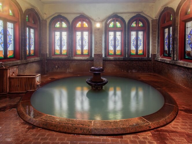 - 浪漫風呂(内湯): 昭和25年に造られた、ローマ風呂風の洋風建築。ステンドグラスから差し込む光が水面に反射し、ノスタルジックな雰囲気が漂います。鉄分を多く含む自家源泉を使用。