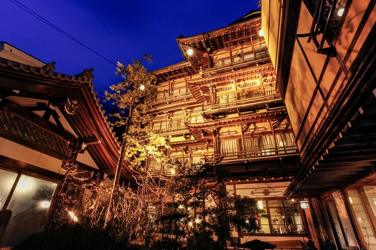 六代目の主人が全国の著名な建築を見て回り、地元の宮大工たちを競わせて造り上げたという逸話が残っています。各客室はすべて異なる意匠で造られており、銘木をふんだんに使用した床の間、富士山や水車を模した飾り窓、舟の形をした天井など、現代の建築基準法では再現不可能な職人技の結晶です。夜になるとライトアップされる斉月楼の外観は、まさに幻想的であり、多くの観光客が足を止めて写真に収める渋温泉のシンボルとなっています。