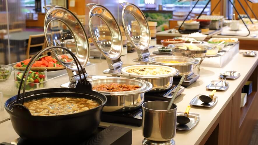名湯でしっかりと疲れを癒やした翌朝は、広々としたダイニングでの朝食バイキングからスタートします。
