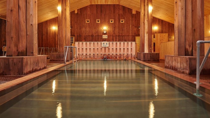 歴史ある古民家や、荘厳な神社仏閣を思わせるような、青森ヒバをふんだんに使った見事な木造建築。高い天井には太い梁が交差し、湯気抜きから差し込む柔らかな光が、木肌の美しい浴槽を照らし出します。