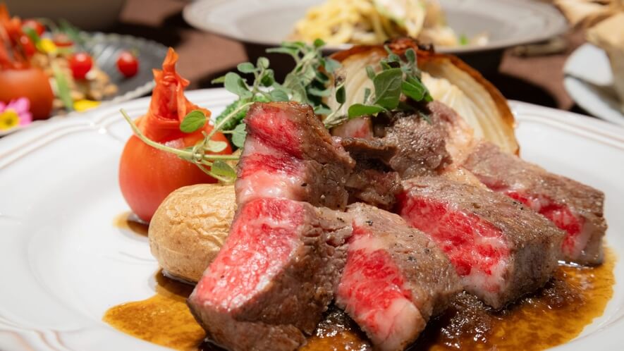 【夕食】プライベートウッドデッキで味わう「かずさ和牛」と農園野菜