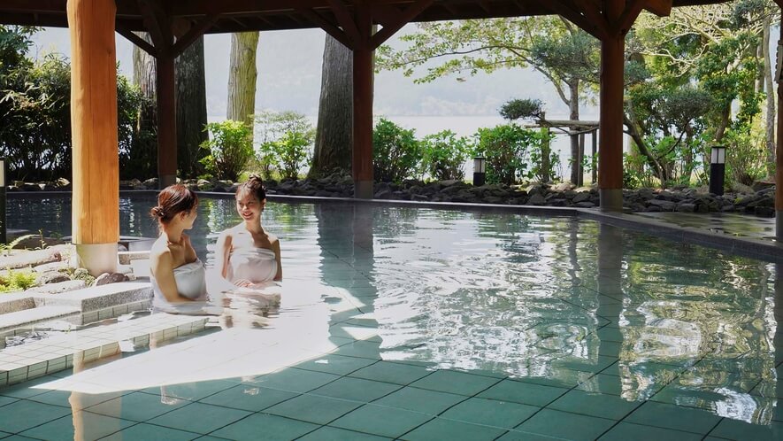 「湖畔の湯」の最大のハイライトは、芦ノ湖にせり出すように設計された屋根付きの露天風呂です。 湯船の縁が芦ノ湖の水面と一直線に繋がって見える「インフィニティ風呂」の構造となっており、湯温は長湯しやすい約42℃に調整されています。晴れた日の日中には、右手側に富士山の山頂部分と、箱根神社の平和の鳥居を同時に望むことができるという、箱根屈指のロケーションを誇ります。夜間は照明が落とされ、波の音を聞きながら星空を見上げる静寂な時間へと変わります。また、露天エリアには4人分の「寝湯」スペースも併設されており、浅いお湯でのんびりと半身浴を楽しむことも可能です。
